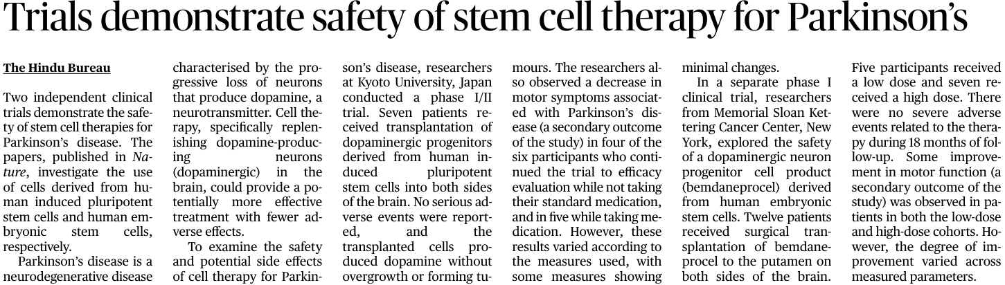 To examine the safety and potential side effects of cell therapy for Parkinson’s, researchers at Kyoto University, Japan conducted a phase I/II trial. Seven patients received transplantation of dopaminergic progenitor cells induced from pluripotent stem cells into both sides of the brain. No serious adverse events were reported, and the procedure showed minimal changes. In a separate phase I clinical trial, researchers from Memorial Sloan Kettering Cancer Center, New York, explored the safety of a dopaminergic progenitor cell product (bemdaneprocel) derived from human embryonic stem cells. Twelve patients received surgical transplantation to the putamen on both sides of the brain. Five participants received a low dose and seven received a high dose. There were no severe adverse events related to the therapy during 18 months of follow-up. Some improvement in motor function (a secondary outcome of the study) was observed in patients with both the low-dose and high-dose cohorts. However, improvement varied across measured parameters.